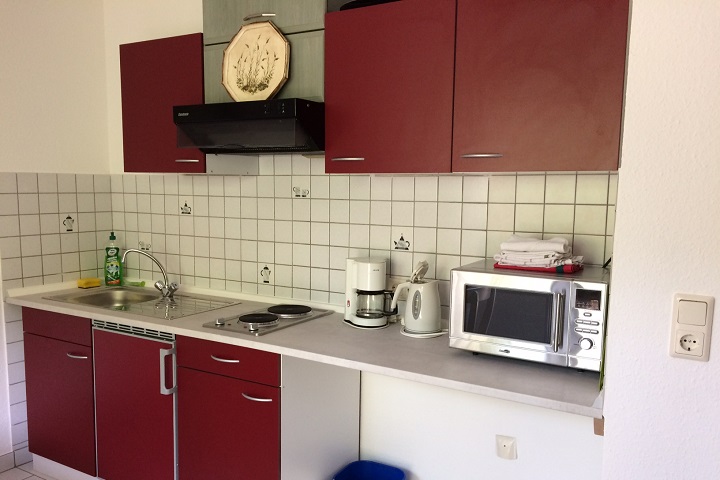 Das Appartement (20 qm) hat eine eigene Küchenzeile, Schlaf-, Arbeitsbereich. Separates Bad auf dem Flur. Monatspreis 920 EUR.
