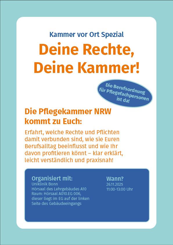 Gerne kommen wir in Eure/Ihre Leitungsbesprechungen und bieten Informationen und einen Austausch über die Arbeit der Pflegekammer an. Nehmt/Nehmen Sie einfach mit uns Kontakt auf! Unsere Emailadresse ist: team-pflegekammer@ukbonn.de oder ruft einfach einen von uns an.